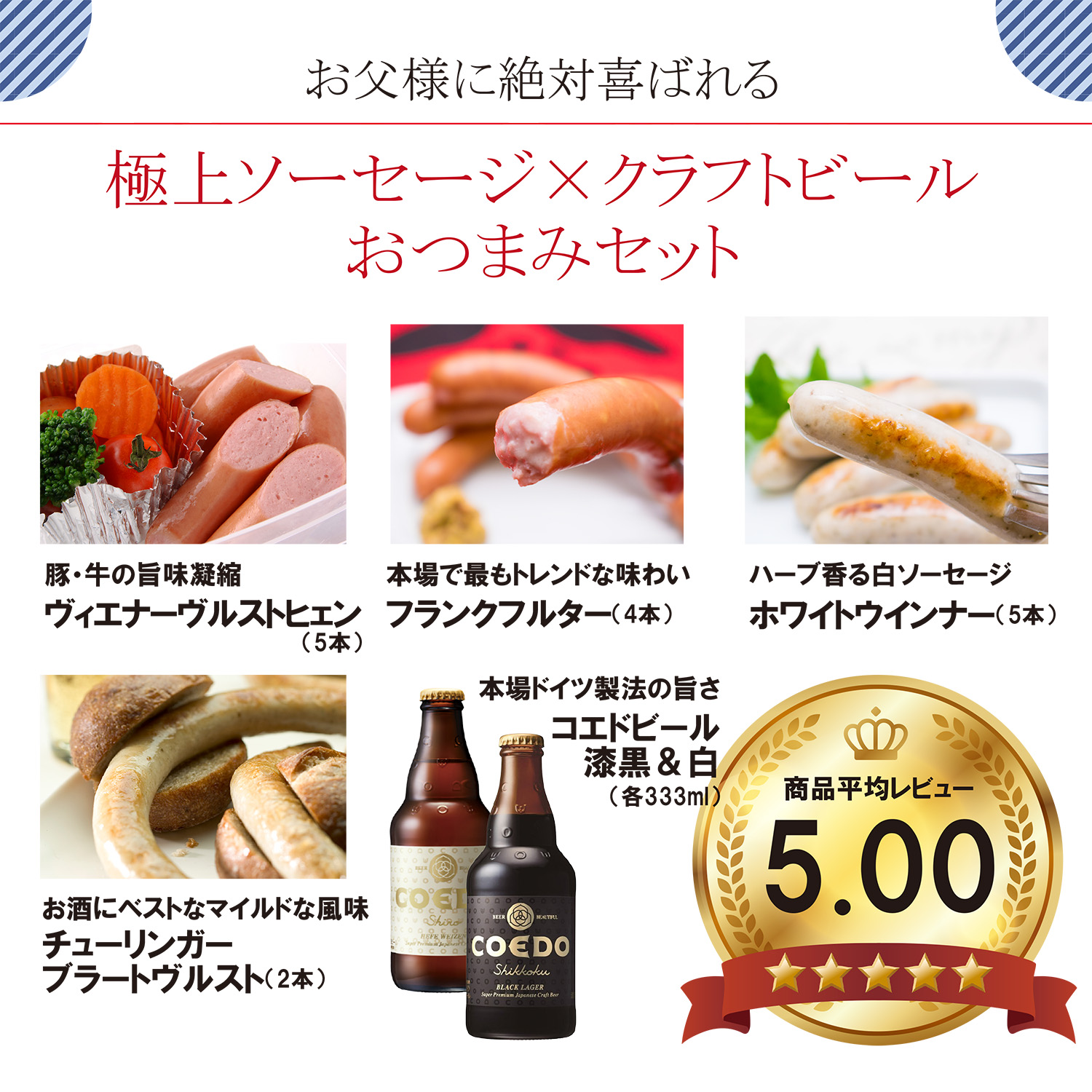 内容量 | 【ヴィエナーヴルストヒェン】97g(5本) 【フランクフルター】135g(4本) 【ホワイトウインナー】97g(5本) 【チューリンガーブラートヴルスト】120g(2本) 【コエドビール白】333ml(1本) 【コエドビール漆黒】333ml(1本) |